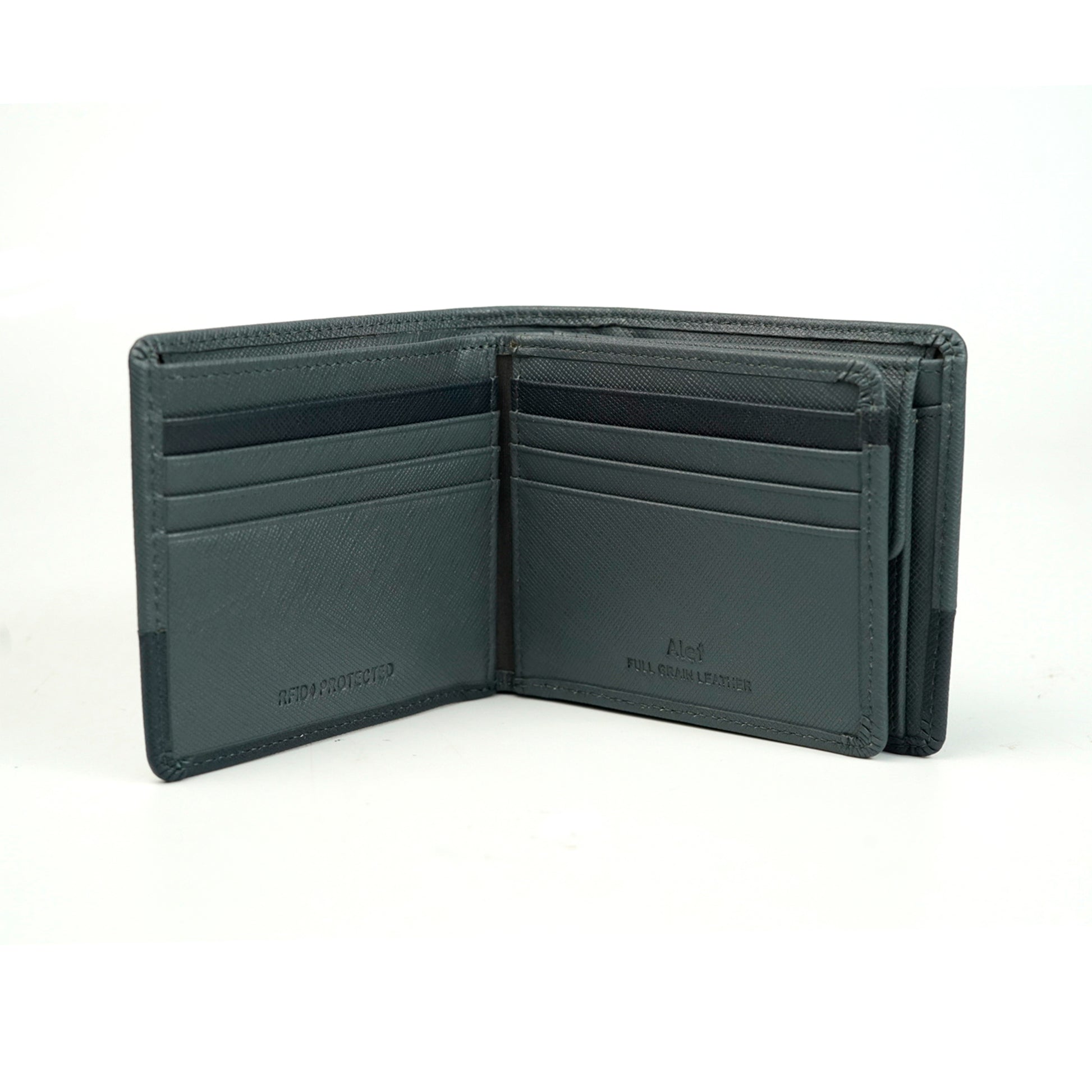 The Alef Tokyo Bifold Leather Wallet with Centre Flap and Coin Pocket is crafted from high quality Saffiano leather. Its interior features eight card slots, a window card slot, a snap button coin pouch, four side slip compartments, two dollar note compartments, and a secret dollar compartment to keep your daily essentials safe in place. Available in two stylish colours combinations of Brown-Cafe and Grey-Navy.